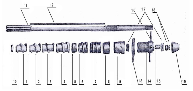 (2)榨螺的安裝:將榨螺立起細端向上,裝上檔圈,在把榨螺由1號起依次裝于軸上,然后用鎖緊螺母壓緊,以防油渣深入榨螺孔內,影響榨螺的拆卸。(調節螺母使調節栓兩端是8309軸承,裝時兩軸承大孔面均靠在調節螺栓的兩端面。榨螺整體裝齊后用兩個(M42×2)的螺帽背緊,背緊時注意兩個8309軸承的縫隙 。用手搬轉調節螺栓,感到轉動靈活時即可。